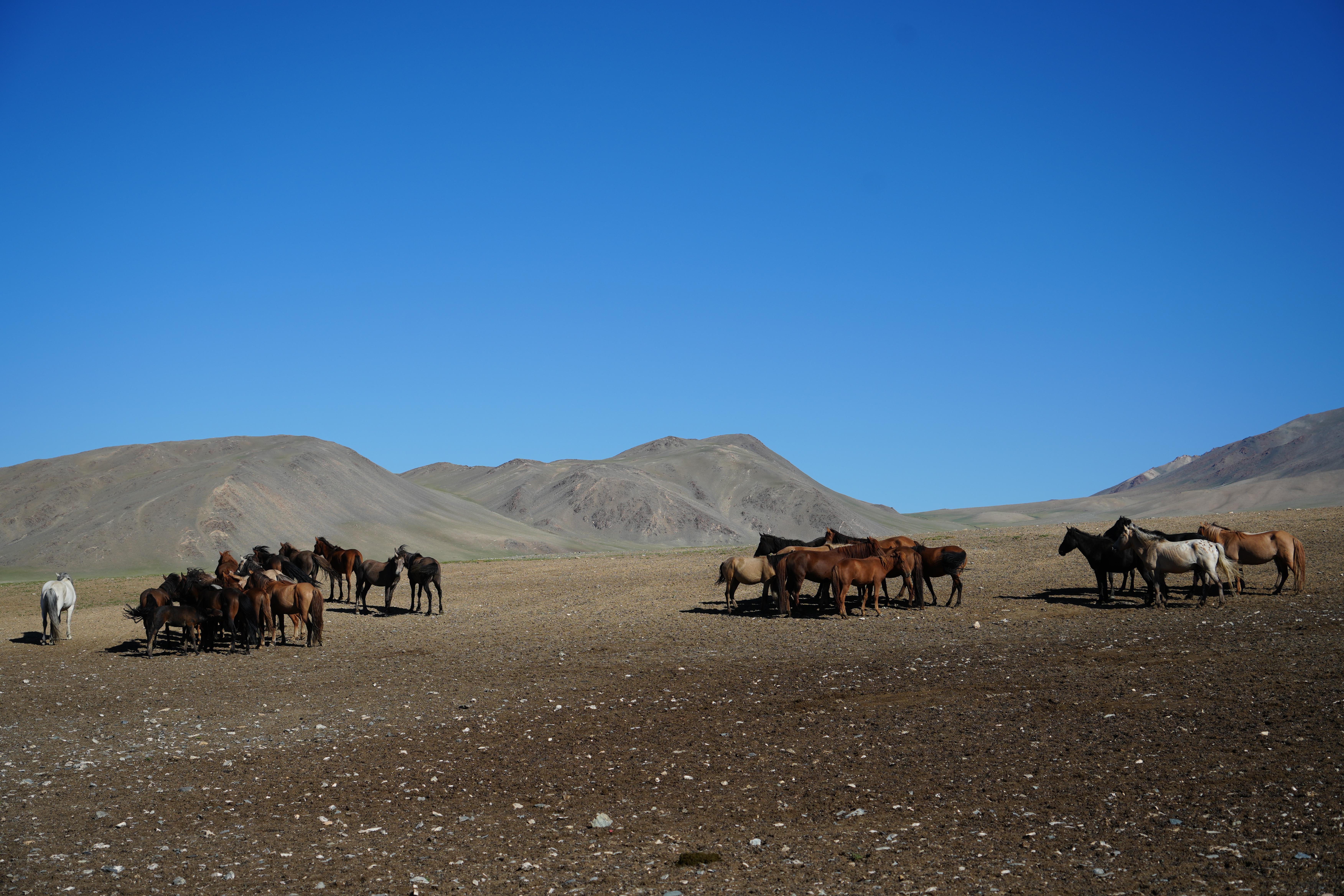 A free-roaming horse herd in the arid, high-altitude Govi-Altai Province, Mongolia, August 2023.